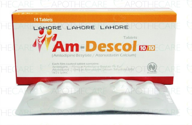 Product Name: AM Descol Tab 10mg/10mg 14'sProduct Form: TabletsPack Size: 14'sMarketed By: Nabiqasim Industries (Pvt) ltdGeneric Category: Anti-HypertensiveIngredients: Amlodipine 10mg , Atorvastatin 10mg