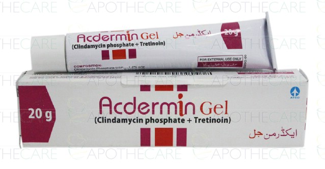 Product Name: ACDERMIN Gel 20gmProduct Form: GelPack Size: 20gmMarketed By: ATCO LABORATORIES (PVT) LTDGeneric Category: Anti-Acne Ingredients: Clindamycin Phosphate 1.2% + Tretinoin 0.025%