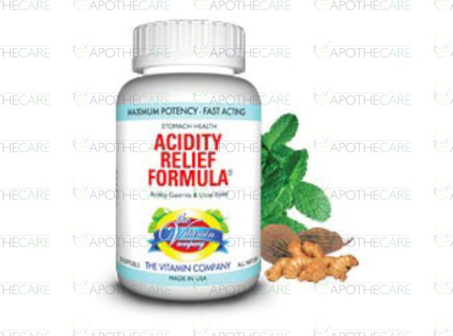 Product Name: Acidity Relief Formula Cap 20'sProduct Form: Softgel CapsulesPack Size: 20'sMarketed By: The Vitamin CompanyGeneric Category: Nutritional Supplement Ingredients: Herbal blend of acidity relief formula