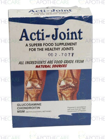 Product Name: Acti-Joint Tab 30'sProduct Form: TabletsPack Size: 30'sMarketed By: Actimed PharmaGeneric Category: ANTI-RHEUMATICIngredients: GLUCOSAMINE 500mg, CHONDROITIN 400mg, MSM 400mg