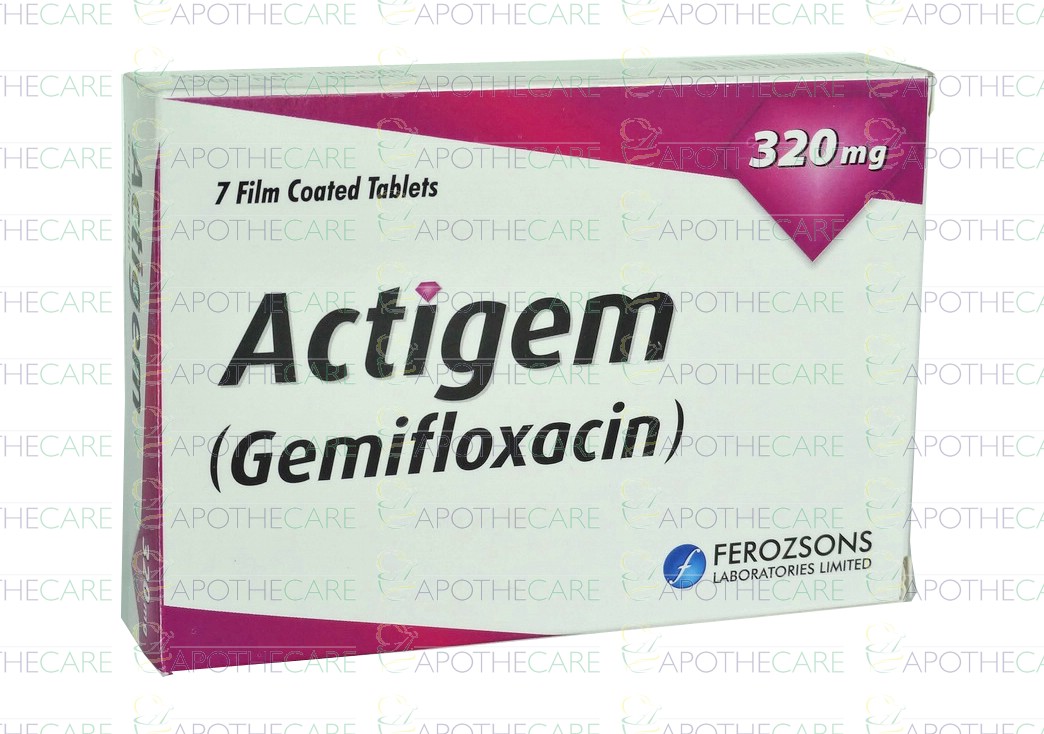 Product Name: Actigem Tab 320mg 7'sProduct Form: TabletsPack Size: 7'sMarketed By: FEROZSONS LABORATORIES LTDGeneric Category: Quinolones Anti-BacterialIngredients: Gemifloxacin