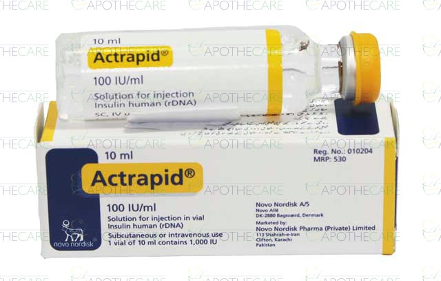 Product Name: Actrapid HM Inj 100IU 1Vialx10mlProduct Form: InjectionPack Size: 1Vialx10mlMarketed By: NOVO NORDISK PHARMA PVT LTDGeneric Category: Fast-acting Insulins Ingredients: Human Regular InsulinStorage Condition: Store at 2 - 80C (Do not freeze)