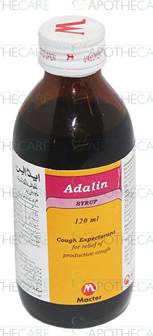 Product Name: Adalin Syp 120mlProduct Form: SyrupPack Size: 120mlMarketed By: MACTER INTERNATIONAL (PVT) LTD Generic Category: ExpectorantIngredients: Each 5ml Contains: Aminophylline 32mg,Diphenhydramine HCL 8mg, Ammonium Chloride 30mg, Menthol 98mg
