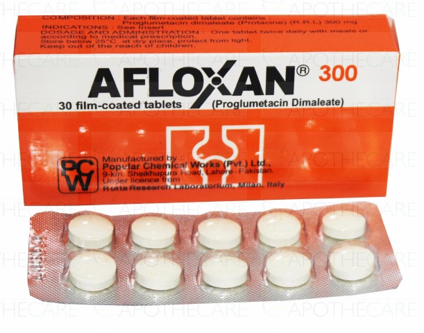 Product Name: Afloxan Tab 300mg 3x10'sProduct Form: TabletsPack Size: 3x10'sMarketed By: Popular Chemical Work(Pvt) LtdGeneric Category: Anti-RheumaticIngredients: Proglumetacin dimaleate