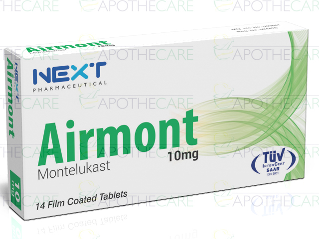 Product Name: Airmont Tab 10mg 14'sProduct Form: TabletsPack Size: 14'sManufacturer: NEXT PharmaceuticalsGeneric Category: Anti-Leukotriene Ingredients: Montelukast sodium