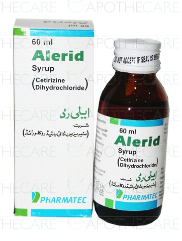 Product Name: Alerid Syp 5mg/5ml 60mlProduct Form: SyrupPack Size: 60mlMarketed By: PharmatecGeneric Category: Anti-Histamine Ingredients: Cetirizine Dihydrochloride