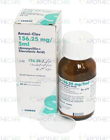 Product Name: Amoxi-Clav Susp 156.25mg/5ml 60mlProduct Form: Suspension Pack Size: 60ml Marketed By: NOVARTIS PHARMA PAKISTAN LTDGeneric Category: AminopenicillinsIngredients: Each 5ml contain: Amoxicillin 125mg,Clavulanic Acid 31.25mg