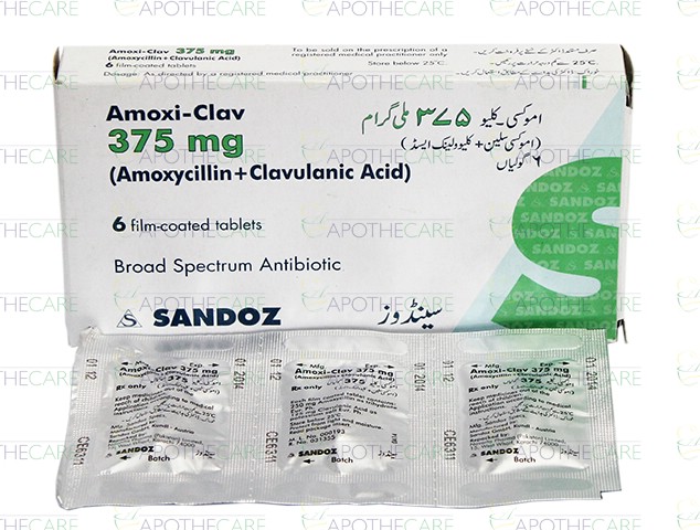 Product Name: Amoxi-Clav Tab 375mg 6'sProduct Form: TabletsPack Size: 6'sMarketed By: NOVARTIS PHARMA PAKISTAN LTDGeneric Category: AminopenicillinsIngredients: Amoxicllin 250mg , Clavulanic Acid 125mg