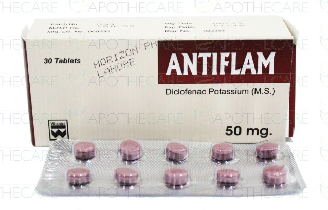 Product Name: Antiflam Tab 50mg 3x10'sProduct Form: TabletsPack Size: 3x10'sMarketed By: Wilshire Laboratories (Pvt) LtdGeneric Category: NSAIDIngredients: Diclofenac Potassium