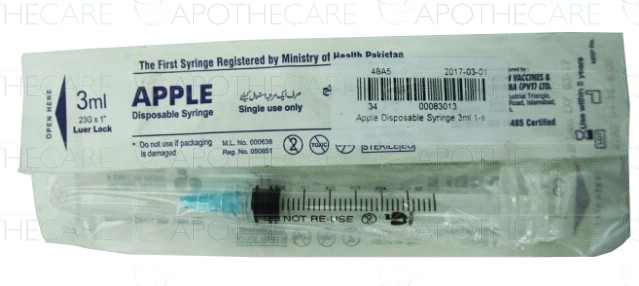 Product Name: Apple Disposable Syringe 3ml 1'sProduct Form: SyringePack Size: 1'sMarketed By: Amson Vaccines & Pharma (Pvt) Ltd