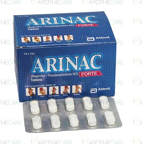 Product Name: Arinac Forte Tab 400mg/60mg 10x10'sProduct Form: TabletsPack Size: 10x10'sMarketed By: ABBOTT LABORATORIES (PAKISTAN) LTDGeneric Category: Cold preparation without Anti-infectivesIngredients: Ibuprofen 400mg, Pseudoephedrine 60mg