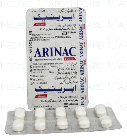 Product Name: Arinac Forte Tab 400mg/60mg 1x10'sProduct Form: TabletsPack Size: 1x10'sMarketed By: ABBOTT LABORATORIES (PAKISTAN) LTDGeneric Category: Cold preparation without Anti-infectivesIngredients: Ibuprofen 400mg, Pseudoephedrine 60mg