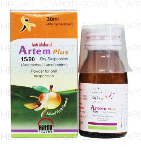 Product Name: Artem Plus Dry Susp 30mlProduct Form: SuspensionPack Size: 30mlMarketed By: Hilton Pharma (Pvt) Ltd.Generic Category: Anti-MalarialIngredients: Each 5ml Contains: Artemether 15mg,Lumefantrine 90mg