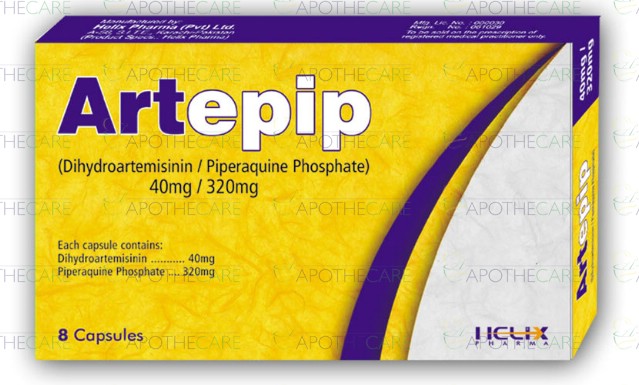 Product Name: Artepip Cap 40mg/320mg 1x8'sProduct Form: CapsulesPack Size: 1x8'sMarketed By: Helix Pharma (Pvt) LtdGeneric Category: Anti-MalarialIngredients: Dihydroartemisinin and Piperaquine Phosphate