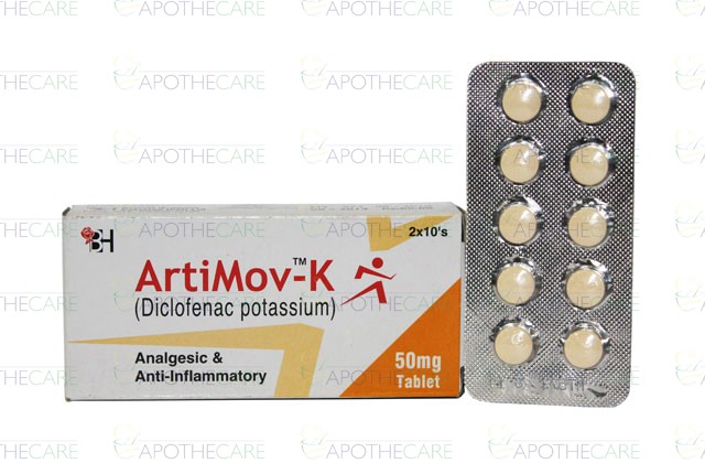 Product Name: Artimov- K Tab 50mg 2x10'sProduct Form: TabletsPack Size: 20'sMarketed By: BARRETT HODGSON PAKISTAN (PVT) LTDGeneric Category: NSAIDIngredients: Diclofenac Potassium