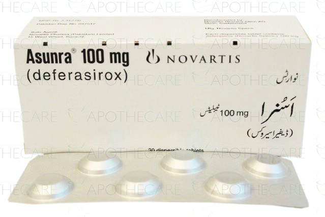 Product Name: Asunra Tab 100mg 30'sProduct Form: Dispersable TabletsPack Size: 30'sMarketed By: NOVARTIS PHARMA PAKISTAN LTDGeneric Category: Iron Chelating AgentIngredients: Deferasirox