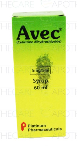 Product Name: Avec Syp 5mg/5ml 60mlProduct Form: SyrupPack Size: 60mlMarketed By: Platinum Pharmaceuticals (Pvt) LtdGeneric Category: ANTI-HISTAMINEIngredients: Cetirizine