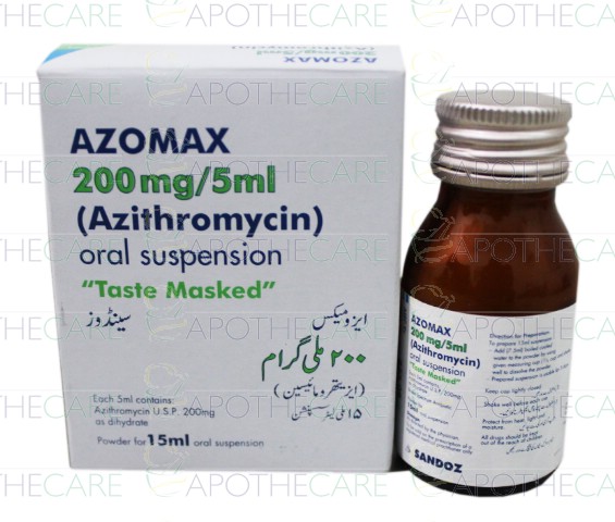 Product Name: Azomax Susp 200mg/5ml 15mlProduct Form: SuspensionPack Size: 15mlMarketed By: NOVARTIS PHARMA PAKISTAN LTDGeneric Category: Macrolide Anti-BacterialIngredients: Azithromycin