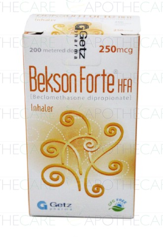Product Name: Bekson Forte HFA Inh 250mcg 1's 300 PacksProduct Form: InhalerPack Size: 300 Packs of 1'sMarketed By: Getz Pharma Pakistan (Pvt) LtdGeneric Category: CorticosteroidsIngredients: Beclomethasone dipropionate