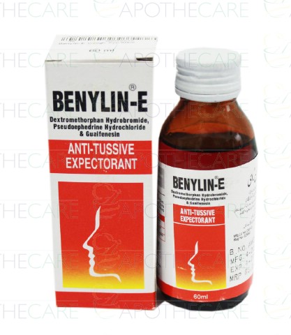 Product Name: Benylin-E Cough Syp 60mlProduct Form: SyrupPack Size: 60mlMarketed By: Johnson & Johnson Pakistan (Pvt) LtdGeneric Category: ExpectorantIngredients: Each 5ml contains: Guaifenesin 50mg , Dextromethorphan 12.5mg, Pseudoephedrine (HCl) 30mg