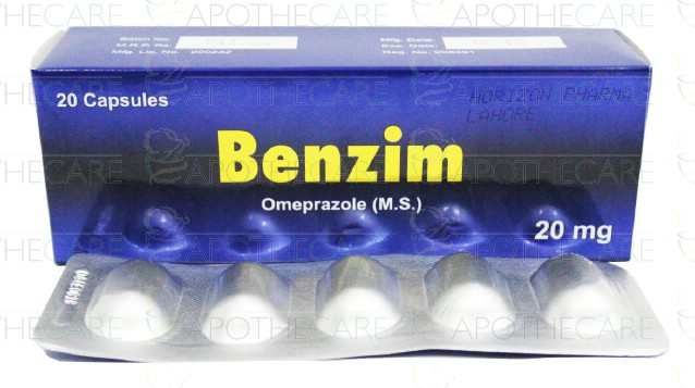 Product Name: Benzim Cap 20mg 20'sProduct Form: CapsulesPack Size: 20'sMarketed By: Wilshire Laboratories (Pvt) LtdGeneric Category: Anti-UlcerantIngredients: Omeprazole