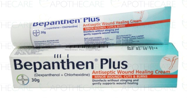 Product Name: Bepanthen Plus Cream 30gmProduct Form: CreamPack Size: 30gmMarketed By: Bayer Health Care Pvt LtdGeneric Category: Skin Care PreperationIngredients: Dexpanthenol 5%, Chlorhexidine 0.5%