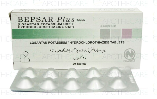 Product Name: Bepsar Plus Tab 50mg/12.5mg 20'sProduct Form: TabletsPack Size: 20'sMarketed By: Nabiqasim Industries (Pvt) ltdGeneric Category: Anti-HypertensiveIngredients: Losartan Potassium 50mg, Hydrochlorothiazide 12.5mg