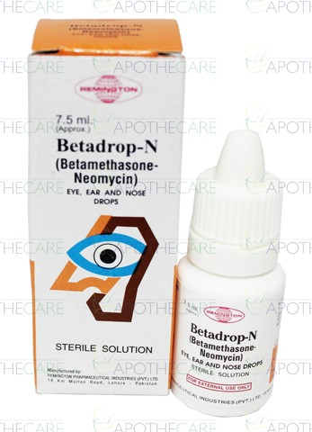 Product Name: BetaDrop-N Drops 7.5mlProduct Form: DropsPack Size: 7.5mlMarketed By: Remington PharmaceuticalsGeneric Category: Corticosteroids, Anti-bacterialIngredients: Betamethasone Sodium Phosphate 0.5%w/v, Neomycin Sulphate 0.1%w/v