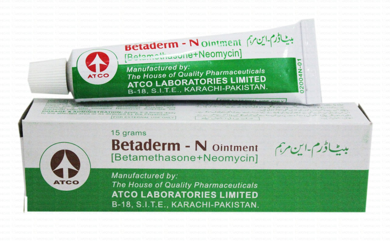 Product Name: Betaderm-N Oint 15gmProduct Form: OintmentPack Size: 15gmMarketed By: ATCO LABORATORIES (PVT) LTDGeneric Category: Corticosteroids + Anti-bacterialIngredients: Betamethasone Valerate, Neomycin Sulphate