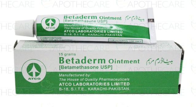 Product Name: BETADERM Oint 15gmProduct Form: OintmentPack Size: 15gmMarketed By: ATCO LABORATORIES (PVT) LTDGeneric Category: CorticosteroidsIngredients: Betamethasone Valerate