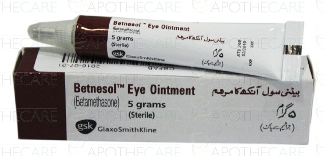 Product Name: Betnesol Eye Oint 5gm Product Form: OintmentPack Size: 5gmMarketed By: Glaxosmithkline Pakistan LimitedGeneric Category: CORTICOSTEROIDIngredients: Betamethasone Sodium Phosphate
