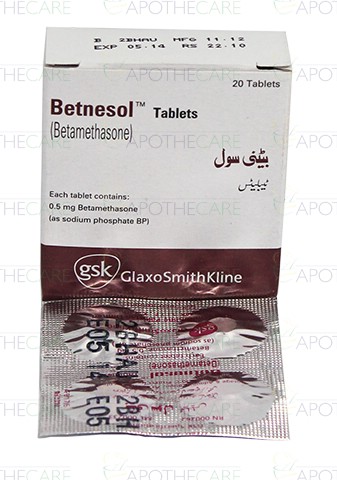 Product Name: Betnesol Tab 0.5mg 20'sProduct Form: TabletsPack Size: 20'sMarketed By: Glaxosmithkline Pakistan LimitedGeneric Category: CORTICOSTEROIDIngredients: Betamethasone Sodium Phosphate