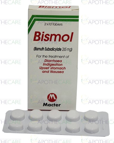 Product Name: Bismol Tab 265mg 20'sProduct Form: TabletPack Size: 20'sMarketed By: MACTER INTERNATIONAL (PVT) LTD Generic Category: Antacid Ingredients: Bismuth Sub-Salicylate