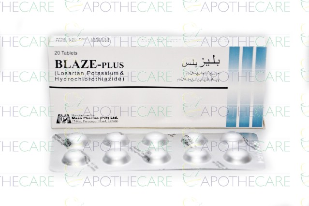 Product Name: Blaze-Plus Tab 50mg/12.5mg 2x10'sProduct Form: TabletsPack Size: 2x10'sMarketed By: MASS PHARMAGeneric Category: Anti-HypertensiveIngredients: Losartan Potassium 50mg , Hydrochlorothiazide 12.5mg