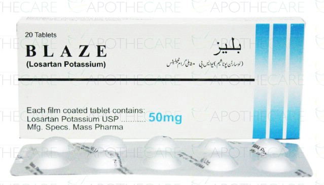 Product Name: Blaze Tab 50mg 10'sProduct Form: TabletsPack Size: 2x10'sMarketed By: MASS PHARMAGeneric Category: Anti-HypertensiveIngredients: Losartan Potassium