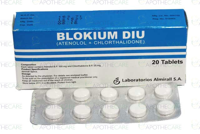 Product Name: Blokium DIU Tab 100mg/25mg 20'sProduct Form: TabletsPack Size: 20'sMarketed By: HIGHNOON LABORATORIES LTD.Generic Category: Anti-HypertensiveIngredients: Atenolol 100mg, Chlorthalidone 25mg