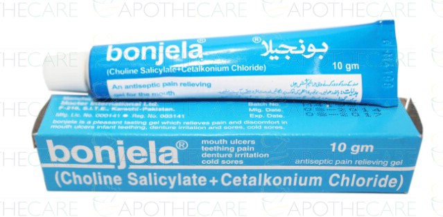 Product Name: Bonjela Gel 10gmProduct Form: GelPack Size: 10gmMarketed By: RECKITT BENCKISER PAKISTAN LTD Generic Category: Mouth ulcer Ingredients: Choline Salicylate 8.7%, Cetalkonium Chloride 0.01%