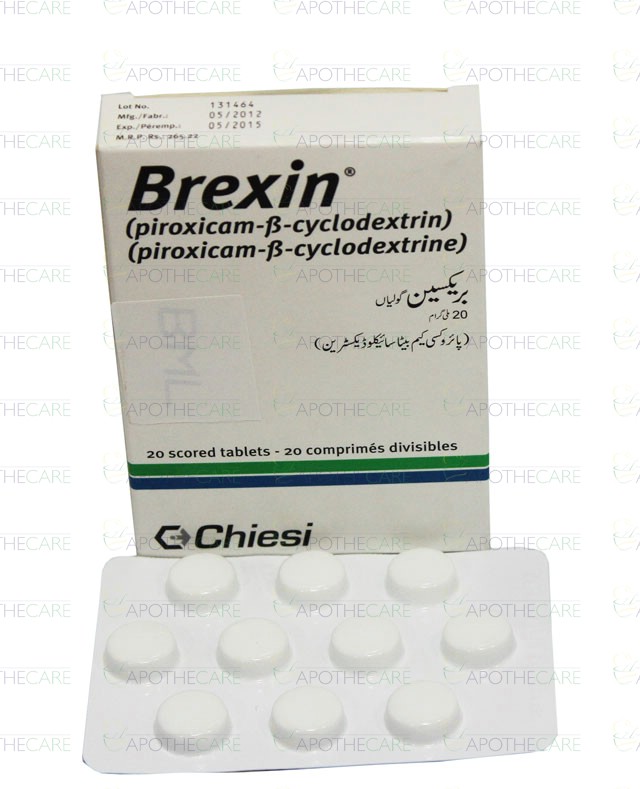 Product Name: Brexin Tab 20mg 2x10'sProduct Form: TabletsPack Size: 2x10'sMarketed By: Chiesi Pharmaceuticals (Pvt) LtdGeneric Category: NSAIDIngredients: Piroxicam Beta Cyclodextrin