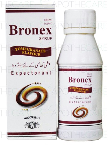 Product Name: Bronex Syp 60mlProduct Form: SyrupPack Size: 60ml Marketed By: Woodward Pakistan (Pvt) LtdGeneric Category: ExpectorantIngredients: Each 5ml Contains Ammonium Chloride 65mg, Chlorpheniramine Maleate 1mg, Phenylephrine HCL 5mg