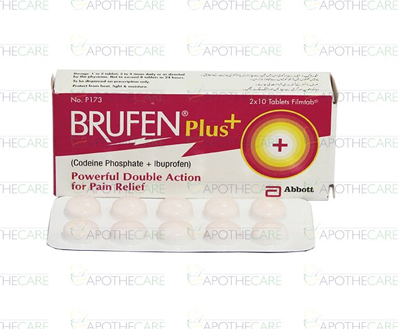 Product Name: Brufen Plus Tab 200mg/20mg 2x10'sProduct Form: TabletsPack Size: 2x10'sMarketed By: ABBOTT LABORATORIES (PAKISTAN) LTDGeneric Category: Opioid AnalgesicIngredients: Ibuprofen 200mg, Codeine Phosphate 20mg