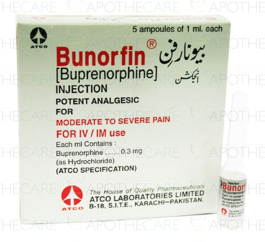 Product Name: Bunorfin Inj 0.3mg 5Ampx1mlProduct Form: InjectionPack Size: 5Ampx1mlMarketed By: ATCO LABORATORIES (PVT) LTDGeneric Category: Narcotic Analgesic Ingredients: Buprenorphine