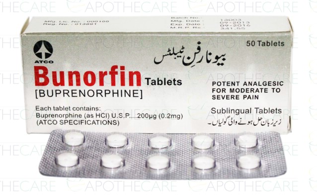 Product Name: Bunorfin Tab 0.2mg 5x10'sProduct Form: TabletsPack Size: 5x10'sMarketed By: ATCO LABORATORIES (PVT) LTDGeneric Category: Narcotic Analgesic Ingredients: Buprenorphine