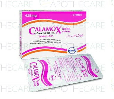 Product Name: CALAMOX Tab 625mg 6'sProduct Form: TabletsPack Size: 6'sMarketed By: BOSCH PHARMACEUTICALS (PVT) LTDGeneric Category: Amino-penicillinIngredients: Amoxicllin 500mg, Clavulanic Acid 125mg