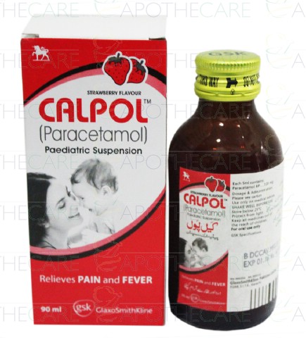 Product Name: Calpol Peads Susp 120mg/5ml 90mlProduct Form: SuspensionPack Size: 90mlMarketed By: Glaxosmithkline Pakistan LimitedGeneric Category: Fever and Pain ReliefIngredients: Paracetamol