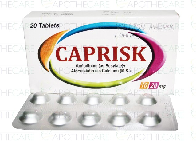 Product Name: Caprisk Tab 10mg/20mg 2x10'sProduct Form: TabletsPack Size: 2x10'sMarketed By: Wilshire Laboratories (Pvt) LtdGeneric Category: Anti-HypertensiveIngredients: Amlodipine 10mg, Atorvastatin 20mg