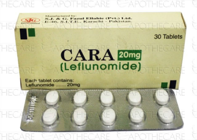 Product Name: Cara Tab 20mg 30'sProduct Form: TabletsPack Size: 30'sMarketed By: SJ & G Fazal ElahiGeneric Category: Disease Modifier For ArthritisIngredients: Leflunomide 20mg
