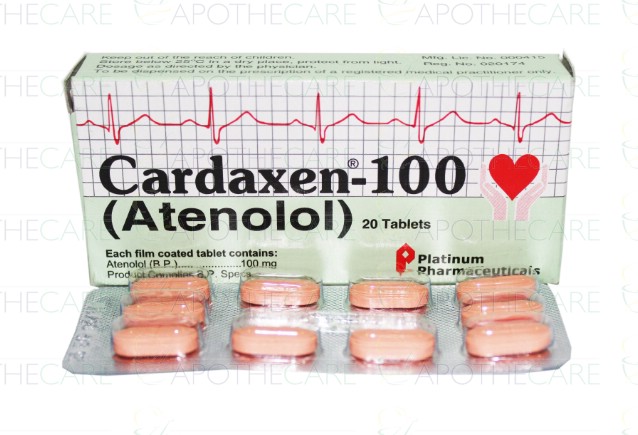 Product Name: Cardaxen Tab 100mg 2x10'sProduct Form: TabletPack Size: 2x10'sMarketed By: Platinum Pharmaceuticals (Pvt) LtdGeneric Category: Anti-Hypertensive Ingredients: Atenolol