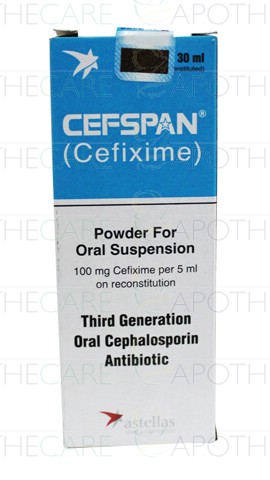 Product Name: Cefspan Susp 100mg/5ml 30mlProduct Form: SuspensionPack Size: 30mlMarketed By: BARRETT HODGSON PAKISTAN (PVT) LTDGeneric Category: Cephalosporin AntibioticIngredients: Cefixime