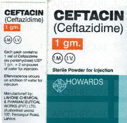 Product Name: Ceftacin IM/IV Inj 1g 1VialProduct Form: InjectionPack Size: 1VialMarketed By: Lahore Chemical & Pharmaceutical Works (Pvt) LtdGeneric Category: Cephalosporin AntibioticIngredients: Ceftazidime