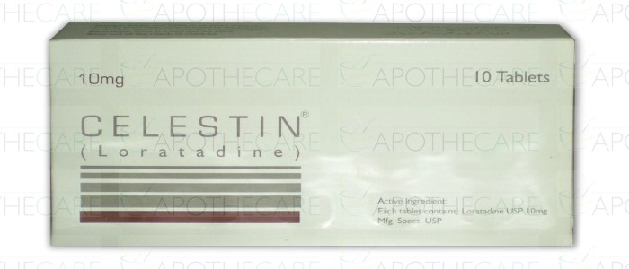 Product Name: Celestin Tab 10mg 1x10'sProduct Form: TabletsPack Size: 1x10'sMarketed By: PHARMA HEALTH PAKISTAN (PVT.) LTDGeneric Category: Anti-HistamineIngredients: Loratadine
